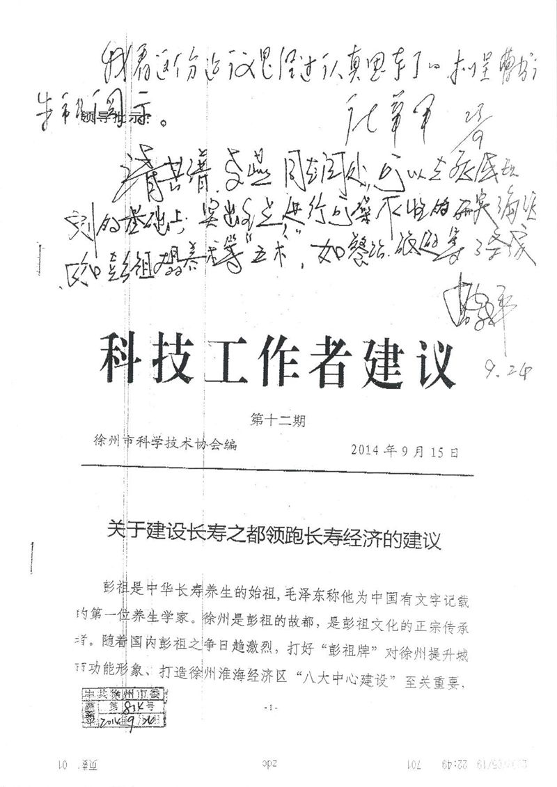 該《建議》從我市建設長壽之都、領跑長壽經濟的三大理由、三大優勢著眼,結合徐州當前的經濟社會發展實際和面臨的發展機遇,提出了“從戰略高度做好科學規劃、從“點、線、面”強勢打出長壽牌、匯聚社會力量,做好長壽大文章”三點建議,貼合實際緊、可操作性強,對我市抓住機遇謀發展、多措并舉惠民生有很強的指導意義。曹書記在批示中重點要求對彭祖攝養術等“五術”,餐飲、旅游等三條線要專門安排有關領導進行研處。 今年以來,徐州市科協共報送4期《科技工作者建議》,期期圍繞我市經濟社會發展進行選題、期期組織專家研討論證精心撰稿、期期有領導批示,很好地發揮了市科協科技思想庫作用,在服務地方經濟社會發展中實現了新作為。